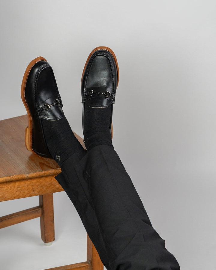 Elevate your style with these refined Black Horsebit loafers. Crafted with a full grain leather upper, lining, and insole for premium comfort, they feature a durable PU outsole and a sleek metal horsebit detail. Perfect for formal and smart-casual looks, these loafers blend classic elegance with modern craftsmanship.