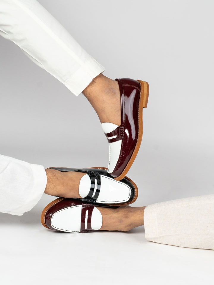 Crafted by hand for the discerning gentleman, these White and white penny loafers feature a premium patent full-grain leather upper, soft leather lining and insole for unmatched comfort, and a lightweight PU outsole for durability. The two-tone design adds a bold, timeless touch—perfect for making a stylish statement in any setting.