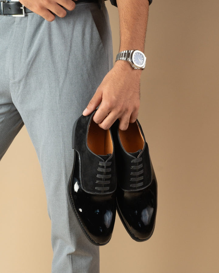 Luxury Derby Shoes in Black Patent and Suede – Sleek Formal Style